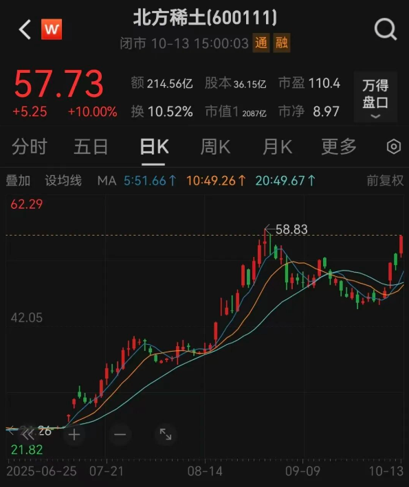 截至10月13日收盘,北方稀土股价涨停,报收57.73元/股,总市值达2087亿元,年内涨幅超过170%。