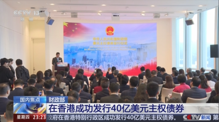 11月5日,中华人民共和国财政部代表中央政府在香港特别行政区成功发行了40亿美元主权债券。其中,3年期20亿美元,发行利率为3.646%;5年期20亿美元,发行利率为3.787%。此次美元主权债券受到市场热烈欢迎,国际投资者认购踊跃,总认购金额1182亿美元,是发行金额的30倍。其中,5年期认购倍数达33倍。
