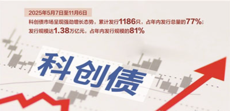 Wind资讯数据显示,2025年5月7日至11月6日,科技创新债券(以下简称“科创债”,包含银行间、交易所科创债)市场呈现强劲增长态势,累计发行1186只,占年内发行总量的77%;发行规模达1.38万亿元,占年内发行规模的81%。