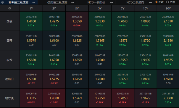 截至今日18点,利率市场收益率多数上行,1Y国债上行1bp至1.41%,3Y国债下行0.2bp至1.37%,5Y国债上行0.25bp至1.59%,10Y国债上行0.2bp至1.81%,30Y国债上行0.6bp至2.15%,10Y国开上行0.15bp至1.87%。信用市场收益率多数上行,2Y期AAA信用债上行0.75bp至1.72%,3Y期AAA信用债下行0.5bp至1.75%,5Y期AAA信用债上行1.5bp至2.02%。转债方面,中证转债指数今日收盘报489点,收涨0.24%。