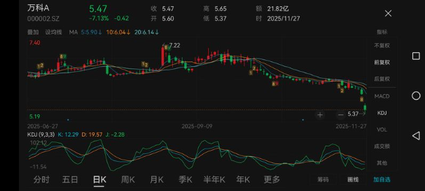 11月27日,收盘数据显示,万科A股股价单日下跌7.13%,报收5.47港元;港股方面同步承压,跌幅为7.73%。