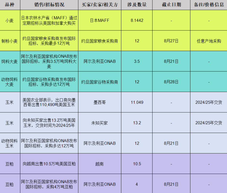 在国际市场方面,日本农林水产省(MAFF)通过定期招标采购了81,442公吨食用小麦,这一采购量未能显着改变市场对小麦供应的预期。约旦国家粮食采购商发布了国际招标,计划采购最多12万吨制粉小麦,提交报价的截止日期为8月27日,这一动态虽有影响,但对市场价格的直接推动作用有限。